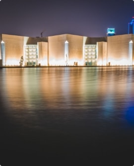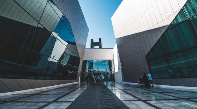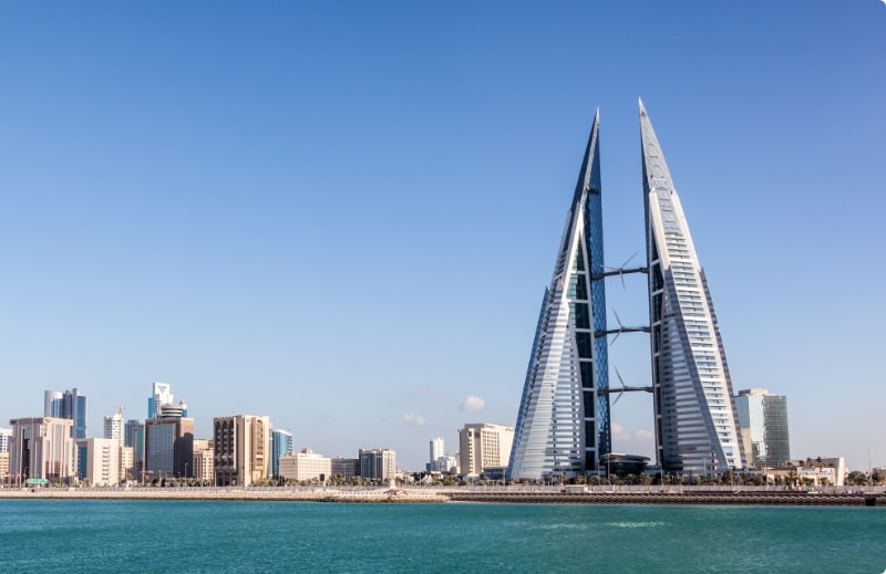"مركز البحرين التجاري العالمي مستوحى من أبراج الرياح العربية التقليدية حيث يستغل شكل المبنى الرياح القادم من الخليج العربي بما يزود المشروع بمصدر متجدد للطاقة. يعتبر مركز البحرين التجاري العالمي (BWTC) أحد المعالم المميزة، فهو يقع بقلب المركز المعاصر و يتكون من برجين بهم 44 طابق تم تصميمهم على شكل شراع ويضم المركز المكاتب و فندق الشيراتون الـ5 نجوم و مودا مول الذي يعتبر وجهة التسوق الفاخرة الوحيدة في البحرين حيث يضم أكثر من 150 متجر لعلامات تجارية فاخرة فضلا عن مجموعة من المقاهي الحديثة و المطاعم الرائعة. بفضل موقعه المتميز و إطلالته على البحر و أفق مدينة المنامة الجذاب، يقدم مركز البحرين التجاري العالمي للمنظمات العالمية والإقليمية الرائدة موقعاً مميزاً لاعمالهم، فيعتبر مركز البحرين التجاري العالمي أول مبنى ذكي بالبحرين و أول ناطحة سحاب بالعالم تدمج توربينات الرياح في تصميمها بحيث تساهم في إجمالي استهلاك الأبراج للطاقة. "