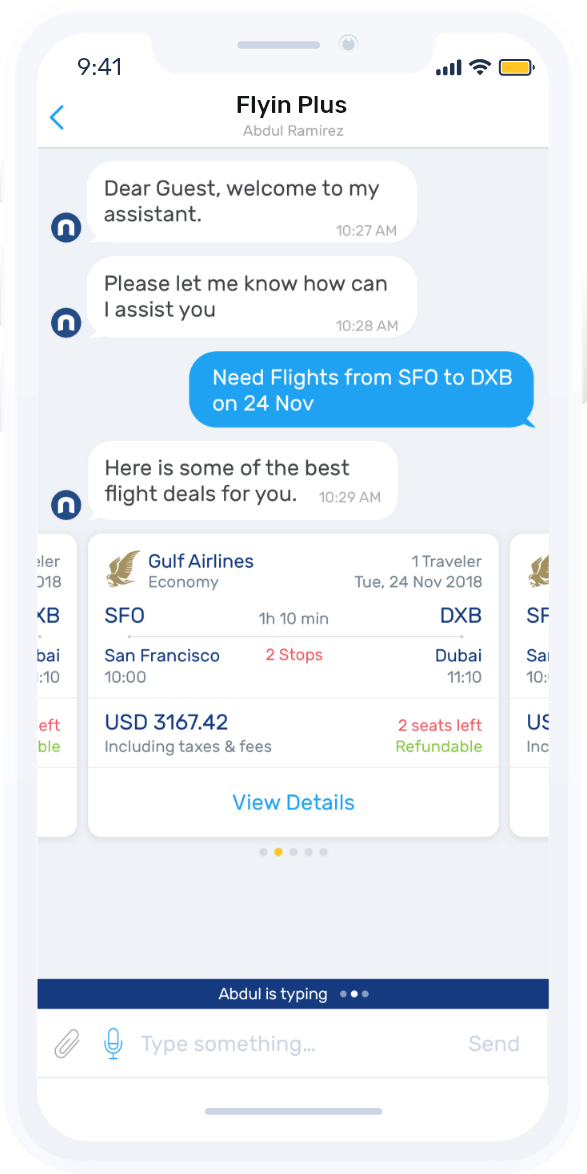 Supports Personalised chat and Flight, Hotel booking in English & Arabic.