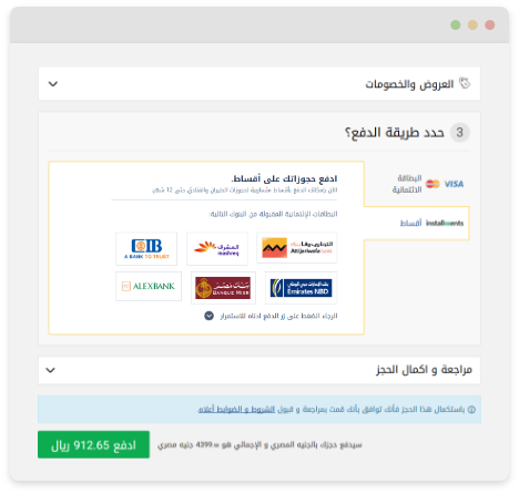 بعد اختيار رحلتك المناسبة والوصول إلى صفحة الدفع يمكنك اختيار الدفع بالتقسيط ثم اختيار البنك الخاص بك واختيار عدد الاقساط المناسبة لك (تأكد من موافقتك على شروط وأحكام البنك)