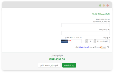 نعم، يمكنك الدفع عن طريق البطاقة الائتمانية من "البنك التجاري الدولي، بنك الإمارات دبي الوطني، بنك المشرق، التجاري وفا بنك، بنك الإسكندرية، بنك مصر.
