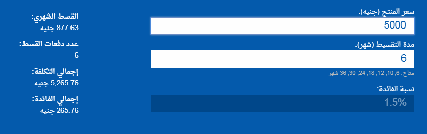 سعر الفائدة من 1.5% حتى 2.25% تختلف حسب البنك الخاص بك و فترة السداد، يمكنك معرفة القسط الشهري من هنا: (آلة حسابية)