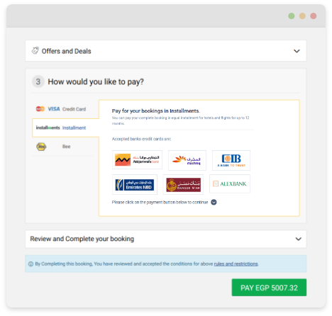 After choosing your trip and deliver the payment page, simply choose INSTALLMENTS then choose your bank and your suitable method (make sure that you have read the terms and conditions)